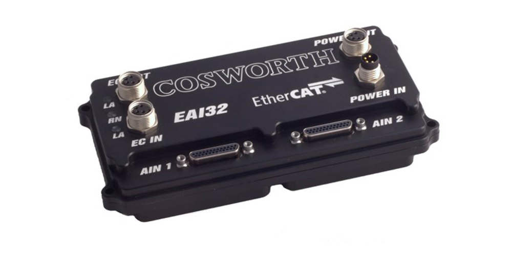 Cosworth’s EAI32 module offers up to 32 high precision, high speed +/-10V analogue inputs in a stand-alone and rugged IP67 aluminium housing. Input resolution is 16bits, with outstanding accuracy and repeatability. Sampling rates go up to 2kHz.