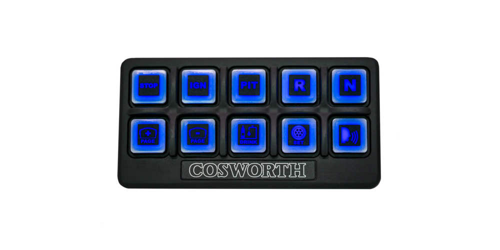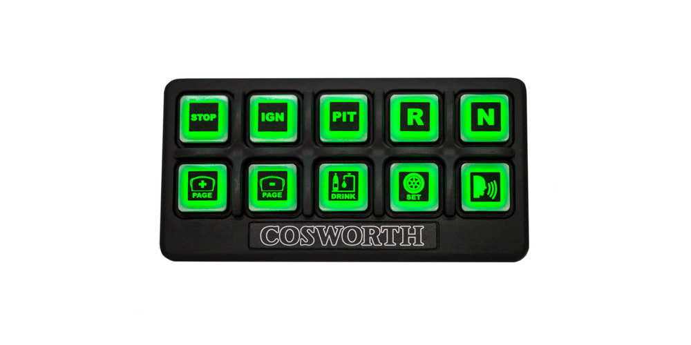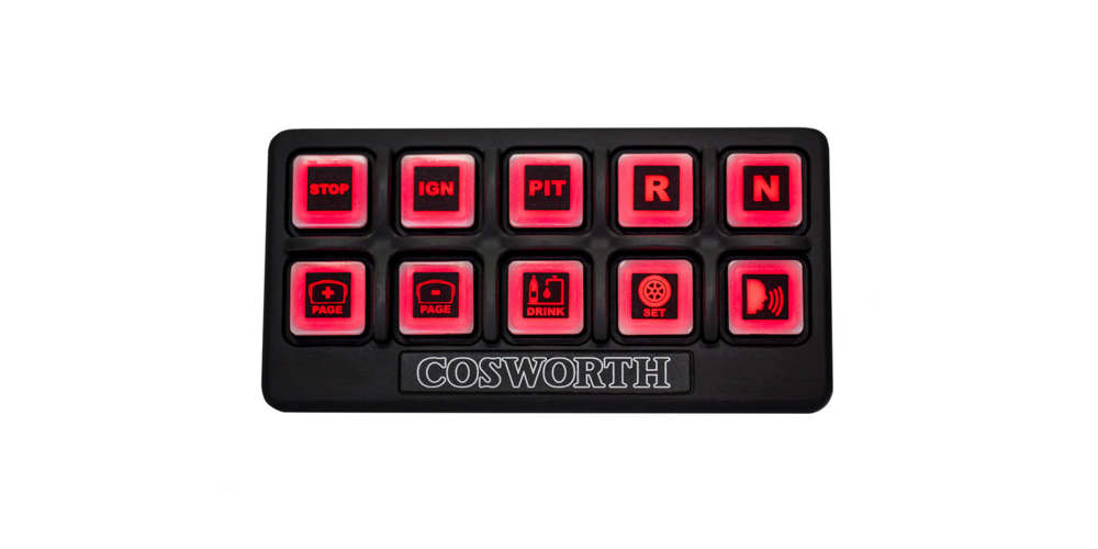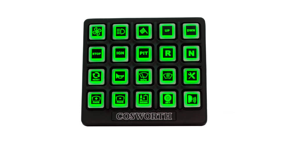 The Cosworth Rubber Switch Panel (RSP) is a fully customisable rubber switch panel supporting up to 20 momentary push button switches in a variety of combinations, with tricolour LED status illumination on each switch.